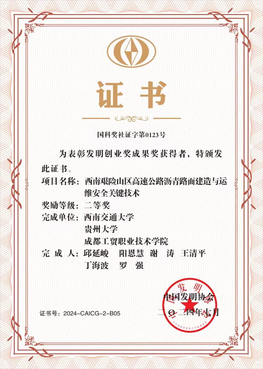 2024年6月,中国发明协会公示了第三届发明创业奖成果奖名单。公司党总支书记、经理王清平参与的《西南艰险山区高速公路沥青路面建造与运维安全关键技术》项目获得2024年度中国发明协会“发明创业奖成果奖”二等奖。此项目由西南交通大学、贵州大学、太阳集团tyc9728合作共同完成,解决西南艰险山区高速公路沥青路面建造与运维安全关键技术问题。